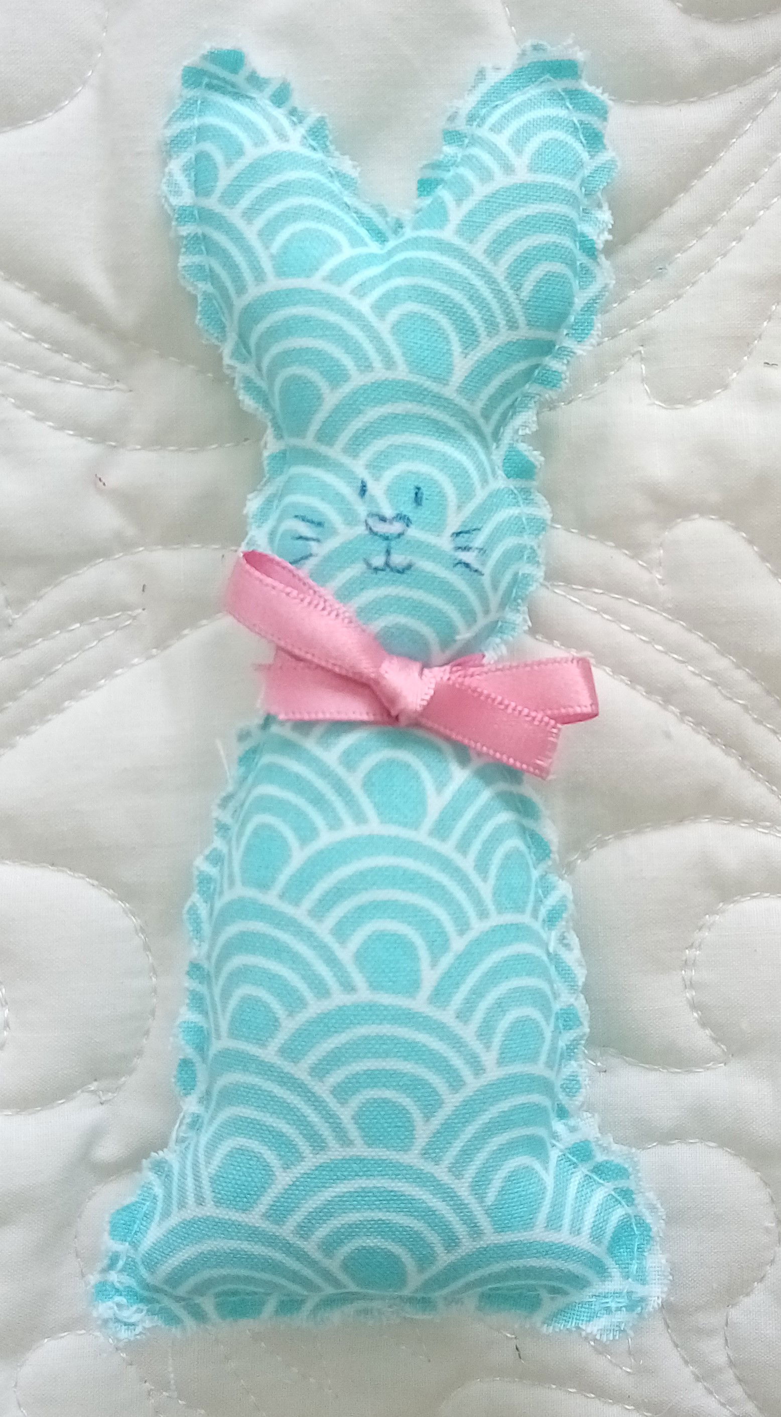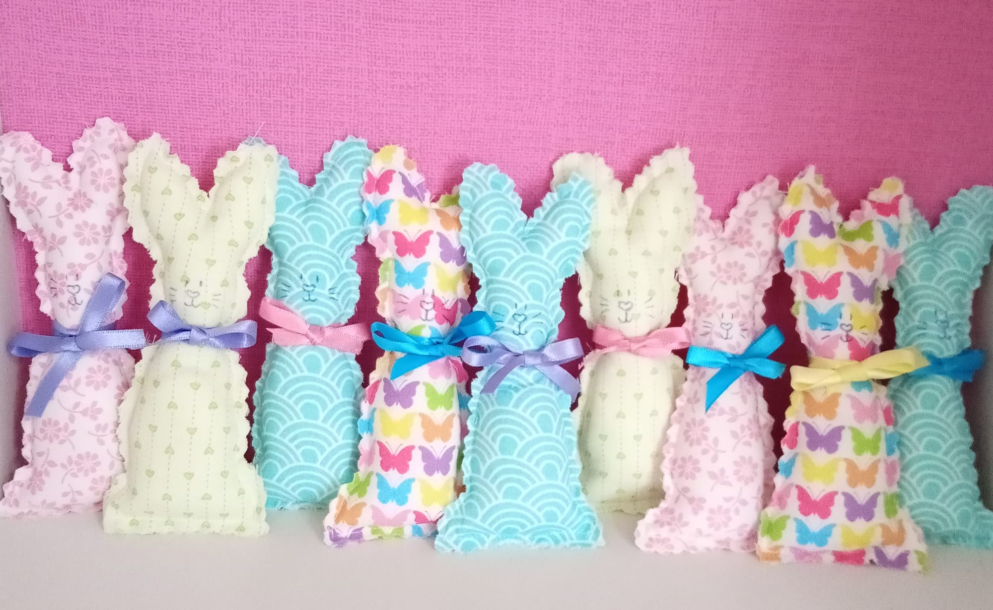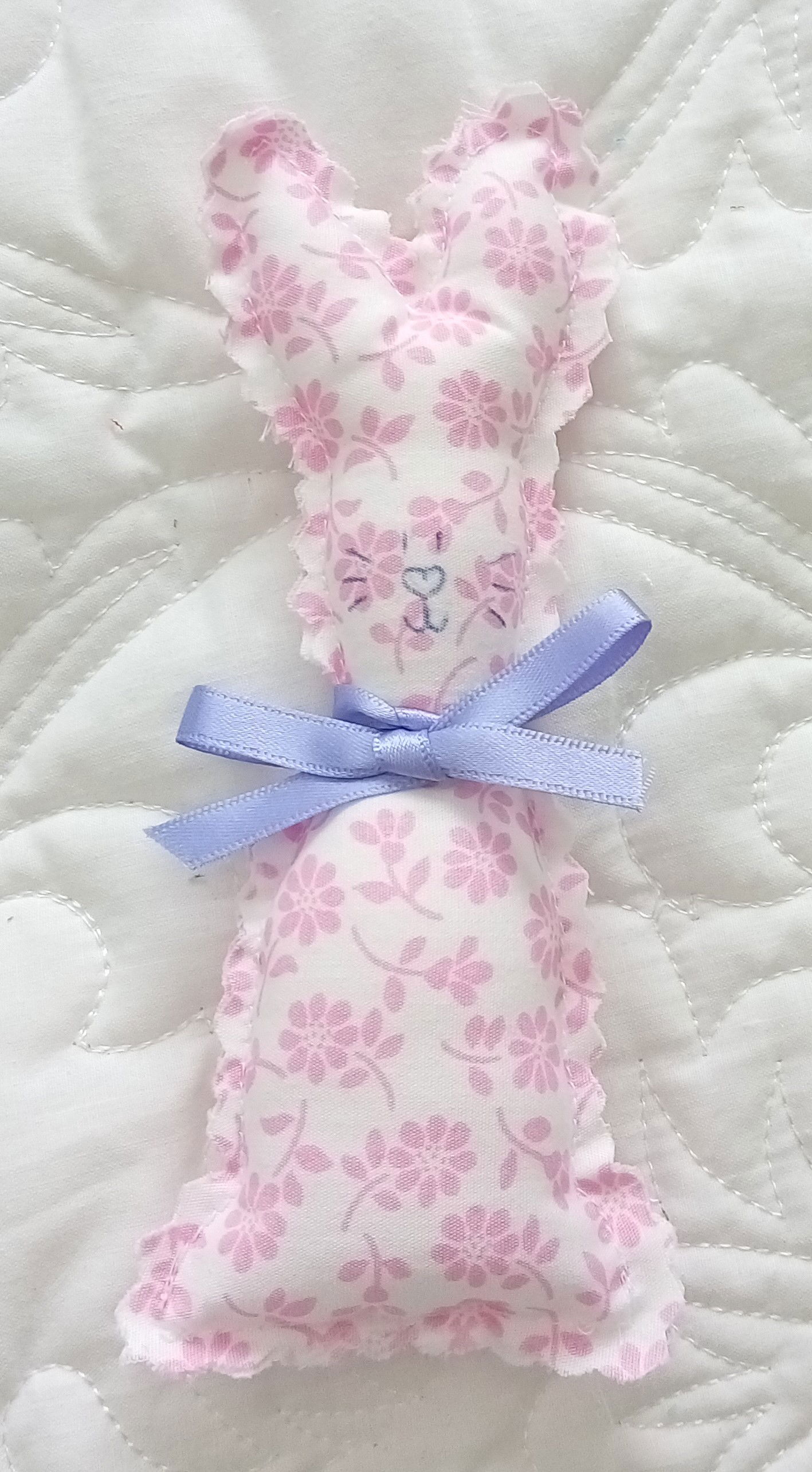 These cute bunnies come in a range of pretty 100% cotton fabrics with a co-ordinating bow ribbon tied around the neck.